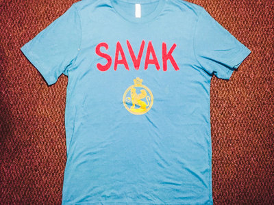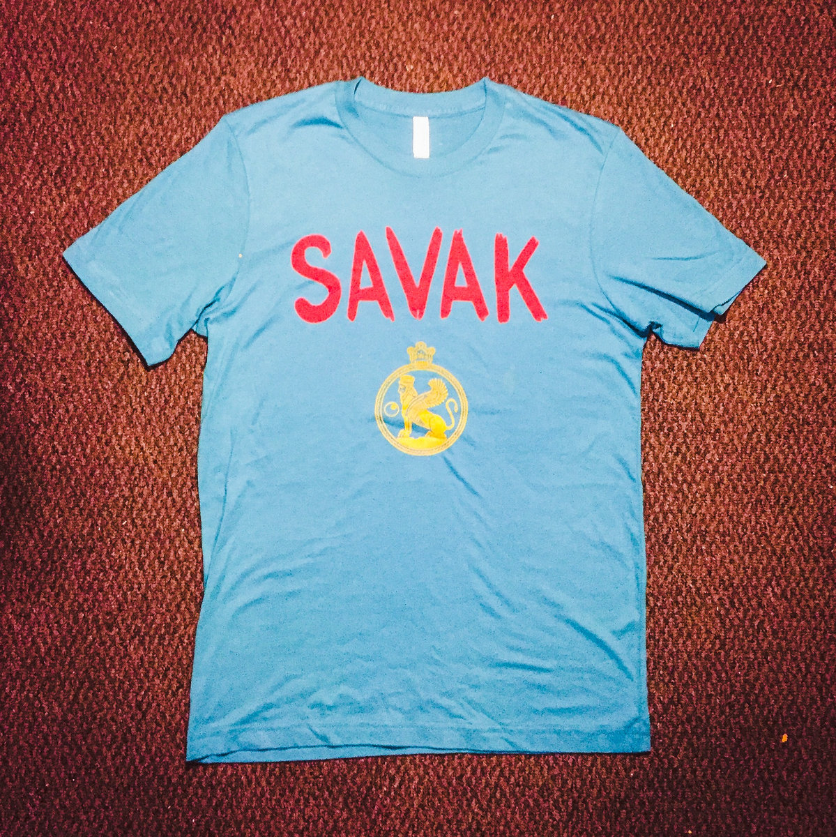 SAVAK in *red* and the lion in *gold* on a blue cotton shirt.
