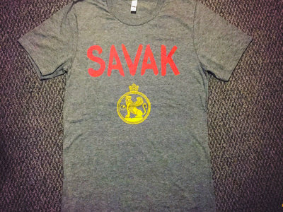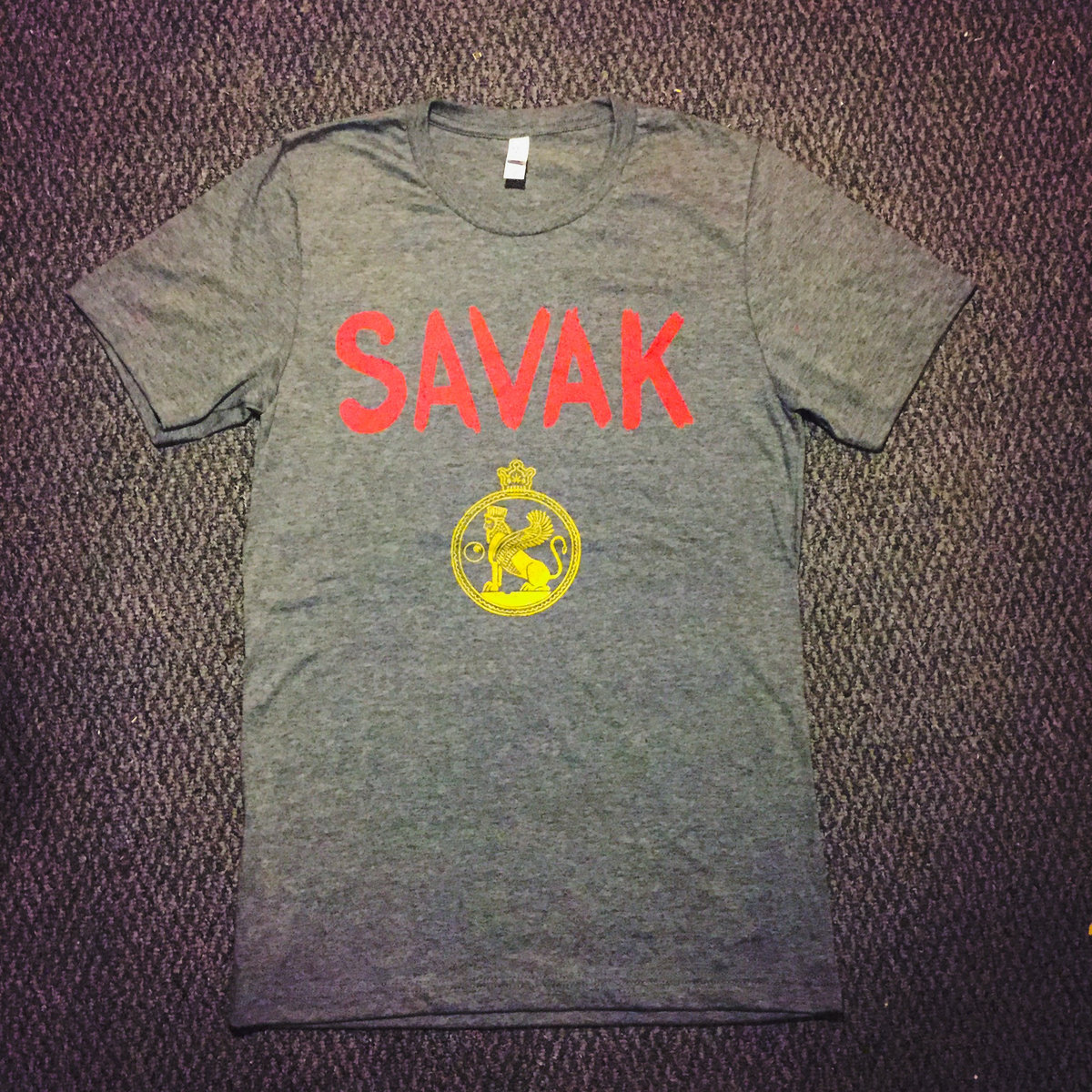 SAVAK in *red* and the lion in *gold* on a gray cotton shirt.